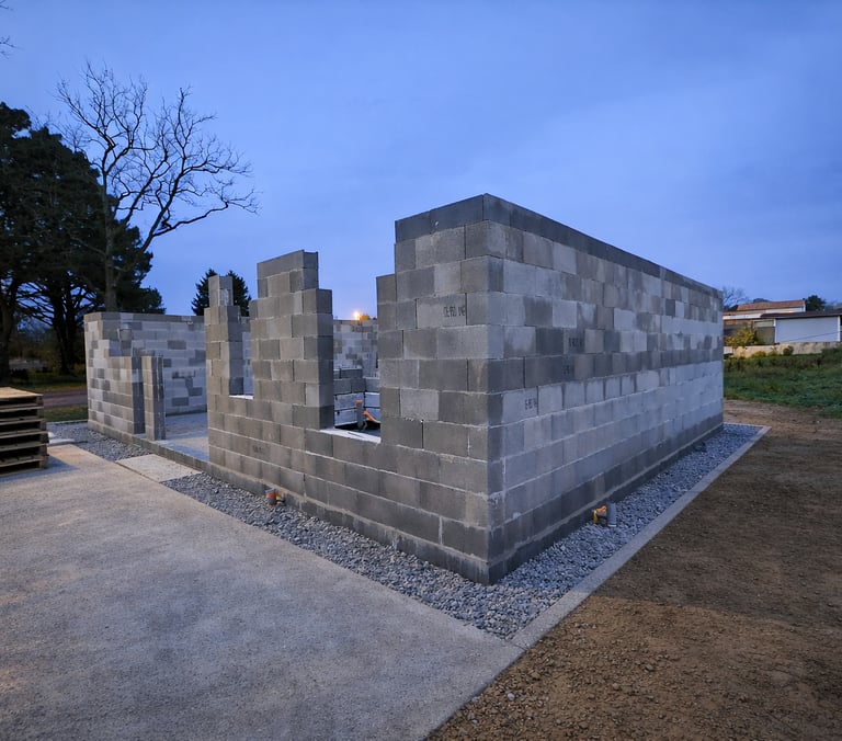 Gros œuvre de maisons individuelles, de l’implantation à l’élévation des murs, réalisé conformément aux DTU et aux exigences décennales.